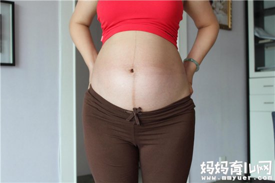 准妈妈腹部从肚脐到耻骨会出现一条垂直的黑色妊娠线,脸上可能会出现黄褐色的妊娠斑,这是怀孕的特征,在分娩结束后就会逐渐变淡或消失。