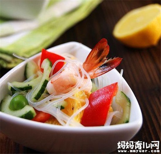 6、取大碗,将黄瓜片、橙子角、红彩椒片、粉丝、虾仁、豌豆拌匀,淋上适量沙拉汁即可。
