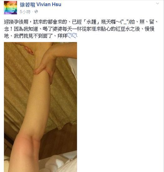 据台湾媒体报道,40岁徐若瑄怀孕满27周,高龄产妇卧床安胎的辛苦让她心情起伏不定,有时乐观看待,有时心情不安,她今在脸书写道“迎接孕后期,该来的都会来的、已经水肿几天啰~(°_°)拍、照、留、念!因为我知道、喝了婆婆每天一杯从家里来贴心的红豆水之后、慢慢地、我们就见不到面了、拜拜”。网友看了纷纷留言,表示心疼。