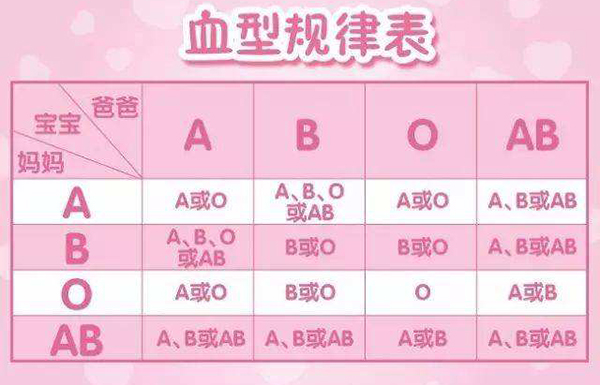 首先,我们先来看一张血型遗传规律表,从下面这两张图中我们可以很明显的可以看出,夫妻双方的血型给合,生出来的孩子将会是什么血型其实都是有一定规律的。比如,O型血和O型血生出来的孩子,绝不可能是A型,B型或 AB型,它只能是O型;就像是AB型与A型或B型的父母,生不出O型的孩子是一样的道理。