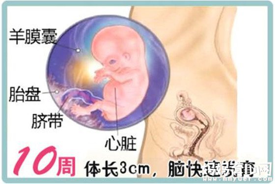 第二个星期(第10周)时,胎儿的大小可达到40mm,形状像扁豆荚。本周胎儿的手腕和脚踝发育完成并清晰可见,宝宝的其它部位也有所增长。胎儿的眼皮黏合在一起,而且胎儿的胎血已经很成熟了。