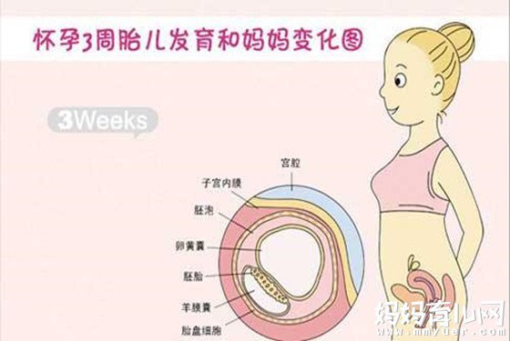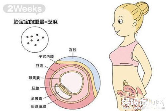 孕3周:这一周受精卵经过3~4天的运动到达子宫腔,在这个过程中由一个细胞分裂成多个细胞,并成为一个总体积不变的实心细胞团,称为桑胚体。着床后,受精卵形似长了四个鳃、挂着长尾巴的鱼一样,并且身体、上头各占一半。此时胎儿仅仅为0.1厘米长,非常轻。