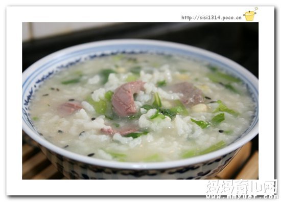 动物肝脏、血和瘦肉中都富含铁,这款粥口感软烂,味道鲜美,适合添加辅食的宝宝食用。根据宝宝的口味和咀嚼能力,猪肝还可换成瘦猪肉、鱼肉片等,给小宝宝吃可切得更碎些,蔬菜也可经常更换,如小白菜、油菜、菠菜等。
