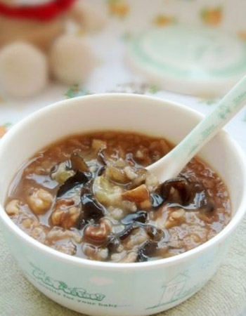 2、再将炒熟的核桃仁压成粉状,择去皮后放入粥里,煮至粘稠即可食用。