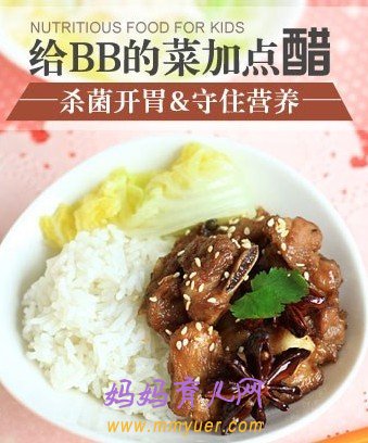 食用醋中含有0.4%-0.6%的醋酸成分,可以有效地抑制多病菌的生长和繁殖,让它们“后继无人”。尤其是到了秋天,细菌和病毒类疾病流行,妈妈们如果在烹饪时添加适量的醋,既可以为宝宝开胃增食,又可以杀灭宝宝体内的病菌,真是一举两得哦。