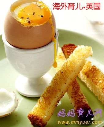 对两三岁的孩子,有一种叫“Eggy soldiers" (鸡蛋战士)也很受欢迎。就是把烤面包切成一条一条,孩子能自己用手拿。鸡蛋煮到半熟,切开上面一些,孩子就能用面包蘸里面的蛋黄吃。这很受小朋友欢迎。