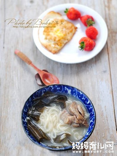 昨晚炖了排骨海带汤,留了些没加盐的汤今早给女儿煮了面条吃;再加一个煎鸡蛋,水果是昨天自己摘的新鲜草莓。本打算一周换个背景的,今早忘了换啦~~[思考]