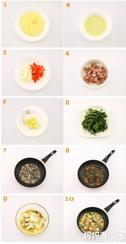 准备食材:吐司1片、鸡蛋2个、彩椒1小块、洋葱1小块、培根1片、土豆1/2个、菠菜1-2棵、大蒜1瓣、盐1/2茶匙、胡椒粉1/2茶匙、食用油1/2汤匙