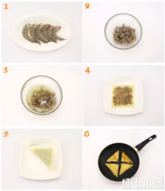 准备食材:虾仁5个、馄饨皮5张、蛋白1个、盐1/2茶匙、料酒2茶匙、胡椒粉少许、食用油适量