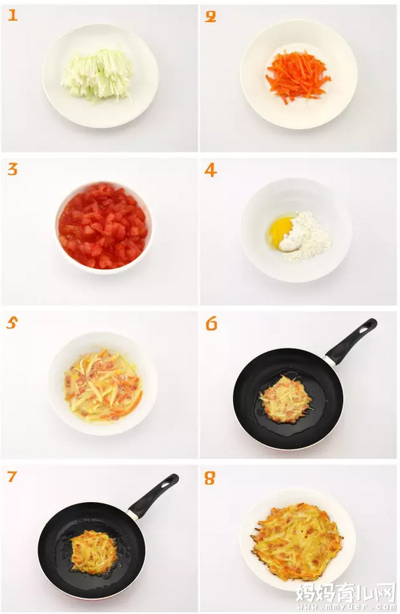 准备食材:西葫芦1/5根、胡萝卜1/5根、西红柿1/4个、鸡蛋黄半个、面粉适量