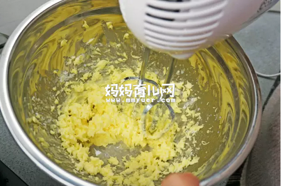 1.黄油必须是软化,不是融化。融化的黄油做出来的饼干不能塑形,不酥松,口感偏硬。软化的黄油还是固体状态,但是可以经过不断地搅打混入空气,打发后颜色变浅,体积变大,使饼干口感酥松。