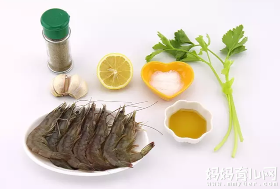 大虾7只、大蒜大半个、香菜2根、柠檬半个、盐少许、橄榄油少许、黑胡椒粉少许(宝宝吃可适当减少调料)