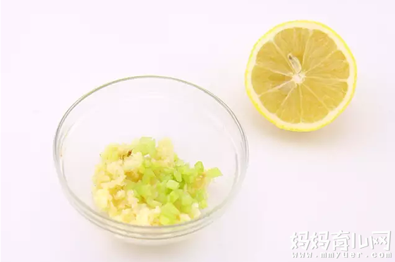 3、将大蒜、香菜倒入橄榄油中,加入盐,挤入柠檬汁,搅拌均匀。