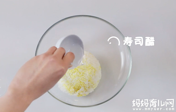 9、用小碗盛一小碗刚煮好的米饭(白米+小米),用勺用力压紧。倒入准备好的容器,加入适量寿司醋。