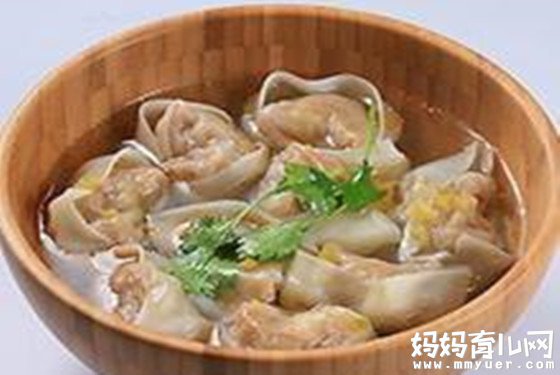 原料:鲜肉末1勺,盐少许,葱末少许,小馄饨皮6片,肉汤1/2杯,紫菜少许。