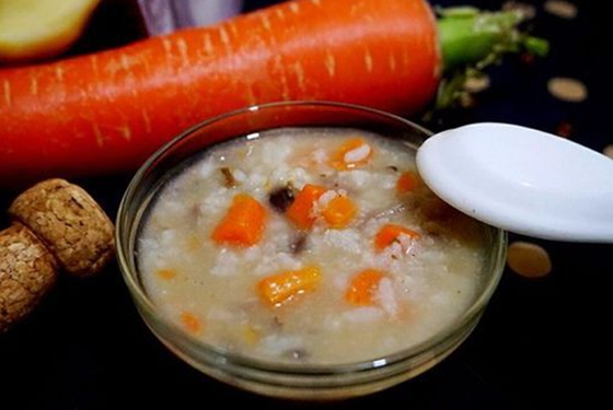 原料:鸡肝2个,胡萝卜10克,大米50克,高汤4杯,盐少许。