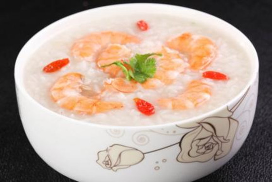 3、锅置旺火上,加入清水,烧沸后下入大米,再沸后改用小火熬煮至快熟时加入煮至半熟得虾仁,再烧沸时,加入少许精盐调好味即成。