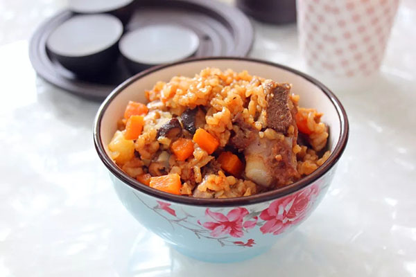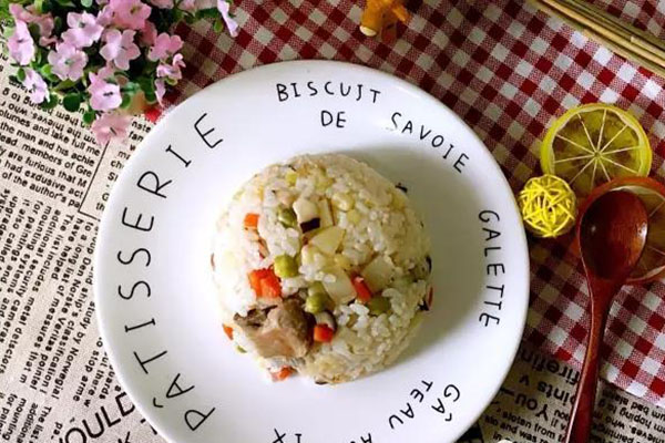 (5)大米掏干净开始煮饭,等到锅中水开了之后,将炒好的排骨蔬菜倒入电饭锅内,煮好之后搅拌均匀再按一次煮饭键,焖一会就可以出锅了,这样的焖饭比较柔软,味道也很足哦!