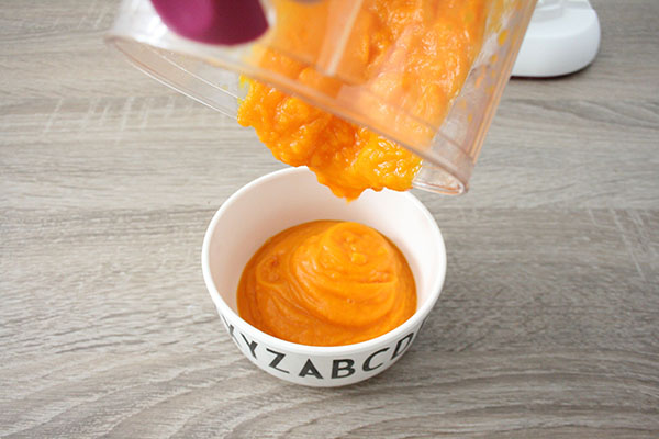 4、南瓜去皮、切块,小火水煮至酥烂,压成南瓜泥,也可以用辅食机或料理机打成泥。