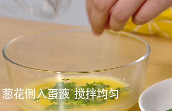 2、加入适量的葱花在打散的鸡蛋液里,搅拌均匀(喜欢吃葱可以多放点)