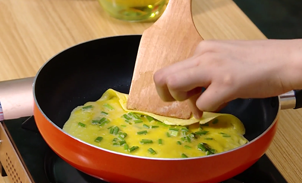 7、等锅底下的鸡蛋凝固之后,用铲子慢慢的把鸡蛋向中间卷起