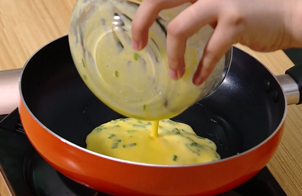 6、把锅左右摇晃,让蛋液摊平变得均匀