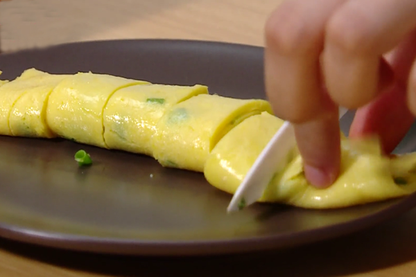 9、盛出卷好的鸡蛋饼,切成小馒头大小的块