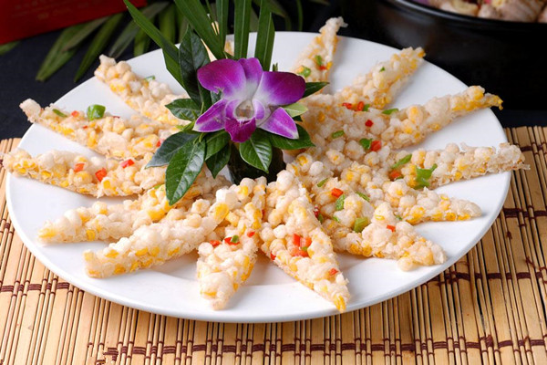 做法:将玉米洗净剥成小粒状,然后放入锅中煮熟,煮熟后将玉米粒捞出放入淀粉中搅拌均匀;平底锅中倒入适量的色拉油,油热后将会玉米放入锅中压平,用文火煎制几分钟,再加入适量的油没过玉米粒,煎熟后过滤出多于的油撒上均匀的白糖即可食用。