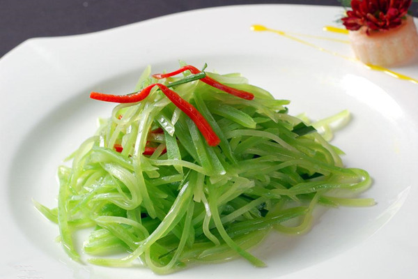 做法:将莴笋洗净后去皮切成细丝,锅中烧热水水开后先将莴笋倒入焯水捞出,将焯好水的莴笋丝放入碗中备用;锅中油烧热后将莴笋均匀的淋在莴笋上,最后撒上葱花和香油拌匀即可。
