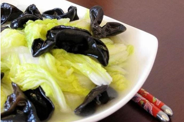 做法:将木耳泡好洗净后撕成小块,白菜切小片,豆腐切小块备用;锅中油烧热后将白菜和木耳放入翻炒,然后加入适量的清水,水开后放入豆腐,所有食材煮好后即可起锅。
