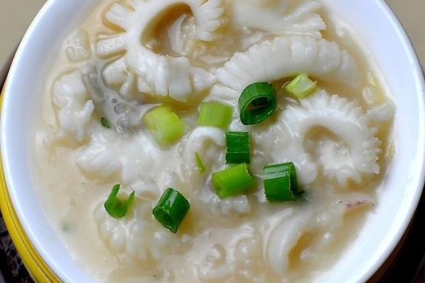 做法:将墨鱼和猪肉清洗干净,提前泡好粳米;然后将洗净的墨鱼切成条状,放入食盐、白糖、料酒、生抽以及生姜丝进行腌制;大米泡好后放入锅中,用大火煮开后转为小火倒入墨鱼同煮,将粥煮制粘稠后加入瘦肉,最后在起锅前撒入适量的葱花和香油即可。