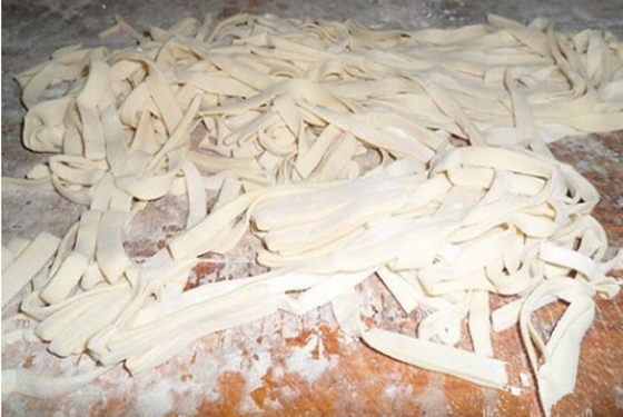 第一步:将面粉和好成面团,用擀面杖把面团擀成面皮,然后再切成薄条,这样面条就做成了,如果觉得麻烦可以直接去市场买做好的干或湿的面条;