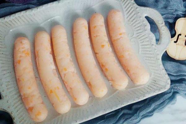 做法:新鲜的虾洗净后去除多余的虾壳和虾线,再滴入几滴柠檬汁去腥,胡萝卜去皮切成大小均匀的块状,然后与鲜虾一同倒入辅食机中制成泥状;再分别加入适量的蛋清和淀粉乳肉泥中搅拌均匀,将肉泥装入裱花袋中,再挤在提前准备好的锡纸上,最后有锡纸包裹成长条,放入蒸锅中蒸10-15分钟即可。