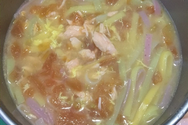 4、接着加入水,水可以加的稍微多一些。待番茄汤煮开之后,下入宝宝的面条,煮至面条软烂。
