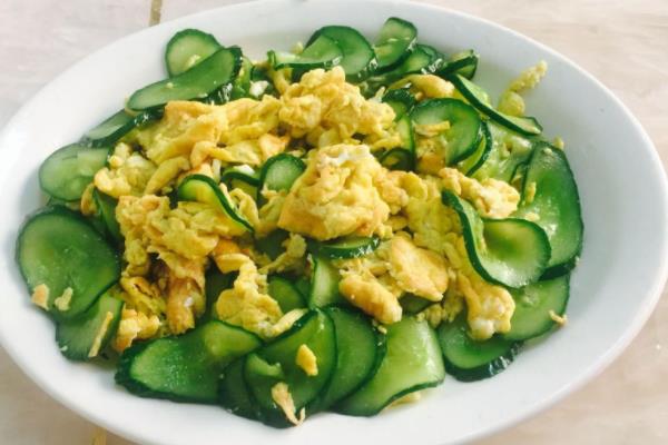 做法:将黄瓜洗净后去皮用刀切成薄片备用,鸡蛋敲碎后倒入碗中充分的搅拌均匀制成蛋液;准备一个平底锅倒入适量的橄榄油,油温合适后先倒入鸡蛋液翻炒均匀,接着再将黄瓜倒入一同翻炒,炒好后加入少量的精盐即可起锅。