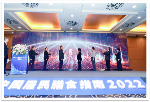 国家卫生健康委食品司一级巡视员张磊时、中国科协科普部信息化处处长刘俊、中国健康教育中心副主任吴敬、国家食品安全风险评估中心主任李宁、中国疾控中心营养与健康所所长丁钢强、农业农村部食物与营养发展研究所副所长王济民、国家体育总局体育科学研究所研究员王梅与中国营养学会理事长、膳食指南修订专家委员会主任杨月欣共同启动了新版膳食指南的发布。