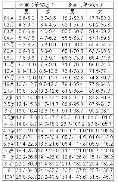 标准范围年龄 体重(kg) 身高( cm) 心智发育