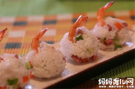 5、在中间放上一颗虾仁。把保鲜膜收圆,留虾尾在外边,捏紧。小心的去掉保鲜膜,一个虾仁饭团就做好了。
