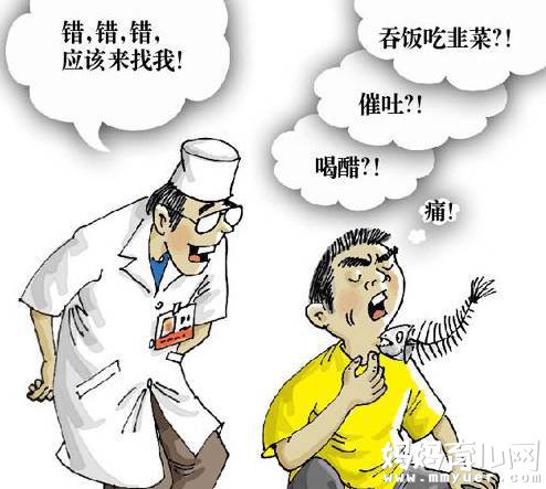 如果是比较硬、粗的鱼刺,千万不要吞进去,曾有人把粗硬的鱼刺吞下去,结果刺穿胃壁,引发胃部感染