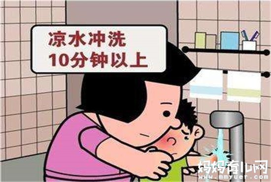 宝宝穿着衣服被热水烫到时,若无法马上脱下衣服,可让宝宝先泡到浴缸里再把衣物脱掉,或用剪刀将衣服剪开取下,接着用自来水大量冲淋,或用洗脸盆舀水盆或浴缸中的水浸泡烫伤的部位,替伤口降温。30分钟到1个小时左右的降温时间即可。