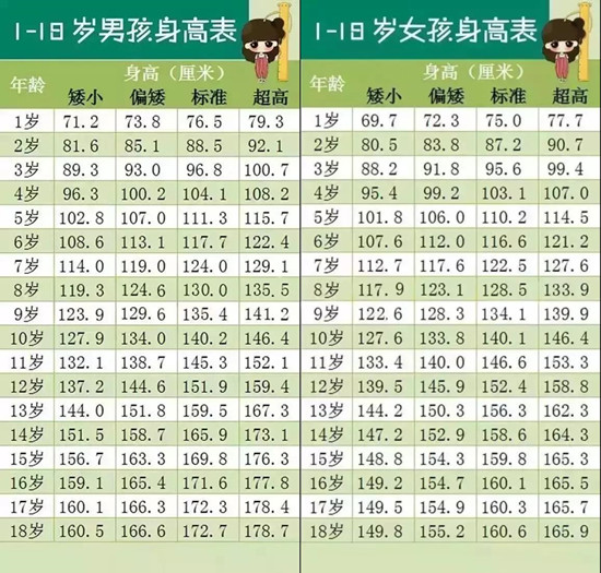 1-18岁男女孩最新身高标准表