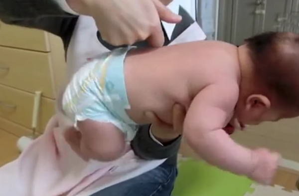 这是向宝宝右边脊柱刮时,宝宝的腿向右上方向伸的姿势图