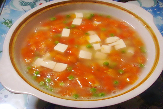 家长首先要用开水来烫一下西红柿,或者是把西红柿煮一下,这样才更好的把番茄的皮给剥掉,然后把番茄切碎放进锅里面炒一下,直到炒出番茄汁,然后加一点清水来把番茄煮开,然后把豆腐也放进煮,大概十五分钟左右,最后把鸡蛋搅拌然后放进汤里面,煮一下之后放点盐就可以了,这个汤是可以开胃,并且营养是很丰富的,宝宝吃了之后可以提高免疫力哦。