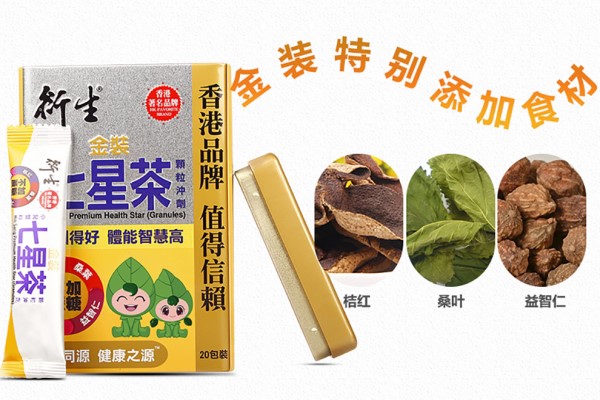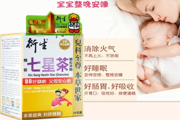 2、衍生在香港已经很多年了,属于香港的老品牌,香港人人皆知。这款金装小儿双料七星茶属于固体饮料,它含有葡萄糖,麦芽糊精,益智仁,山楂,薏仁,淡竹叶,桑叶每次小豆鸡内金,甘草等配料。