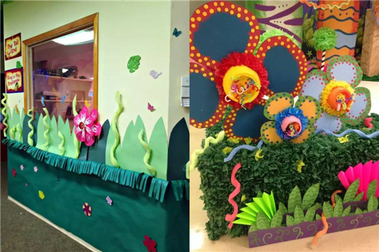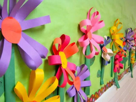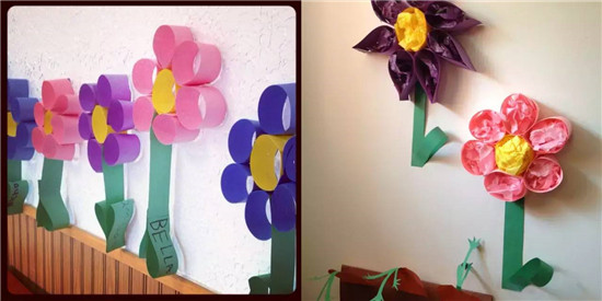 中型的花朵大小适中,好搭配周边布置,更加适合作走廊的设计。在墙裙位置粘贴小碎纸条状的青草,会更加有趣。这样的走廊分分钟搞定。如果想做的更加精致一些,可以参考下图,花瓣为硬纸板,然后进行创意彩绘,花心为废旧碗杯子之类,周围装饰皱纹纸,把毛根插进去做花蕊。