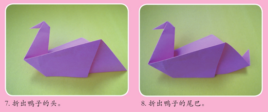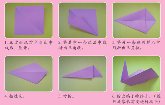 3、教师示范小鸭子的折法,引导幼儿自己动手跟着老师一起按步骤折小鸭子。