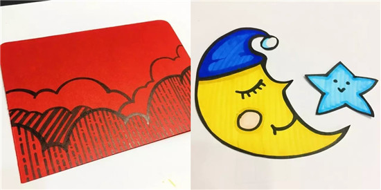 制作步骤:红色卡纸上下对折,还是照例先做封面。用油性记号笔画层层叠叠的云朵~近的云朵画条纹花纹,远的云朵就留白。
