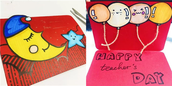 做好的teacher小彩旗用双面胶贴在麻绳上,长度要控制好,在贴小彩旗前,先量好麻绳的长度再贴。用油性记号笔写上英文字母,在空白处画写小装饰。有兴趣的小朋友可以在铅画纸上再画些别的喜爱的图案,贴在卡纸上。完工!就问你简单不简单~