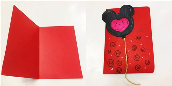 制作步骤: 红色硬卡纸对折,首先装饰封面,白色铅画纸上画一个卡通气球,涂色后剪下来贴在卡纸上(如图),剪一小段麻绳当作气球的绳子一端贴在气球的扎口上。在用彩笔在空余的地方做装饰。