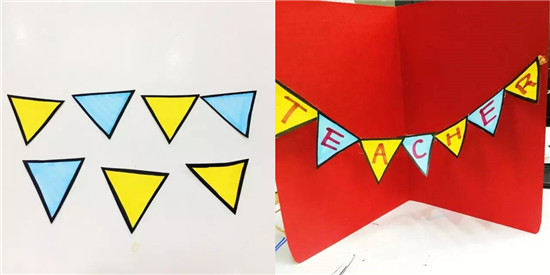 贺卡里要动些小心思~用铅画纸上画7个三角形,间隔涂上浅黄色和浅蓝色,并用彩笔写上teacher。